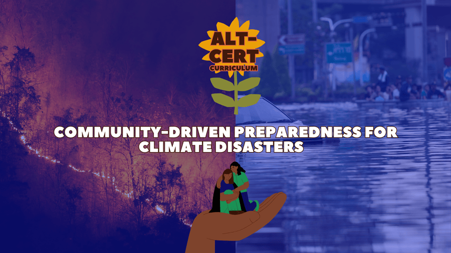 What is Alt-CERT? The Alt-CERT curriculum is both a response and an antidote to the limitations of FEMA's Community Emergency Response Team (CERT) training. Alt-CERT responds to calls from disinvested communities to address community-identified limitations of the federal curriculum through greater focus on understanding the causes and consequences of the climate crisis, practicing community-driven mutual aid, building the power of communities that are left behind in conventional disaster preparedness and response, and directing resources toward community-led climate disaster preparedness, response, and recovery in disinvested communities.